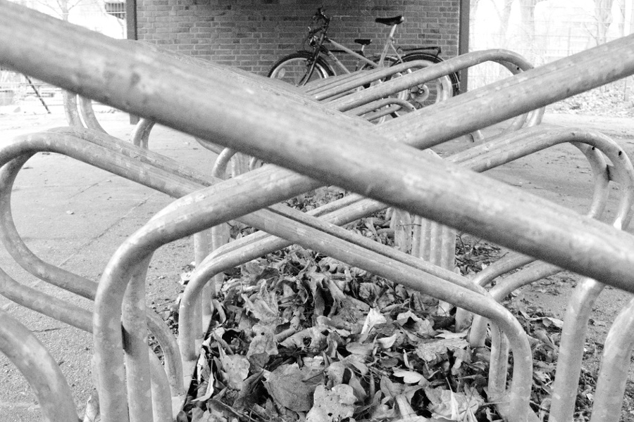 16.02.2013 (Tag 321): Normalerweise stehen viel mehr Fahrräder in diesem Fahrradständer. Schön ist auch das Laub, welches noch zwischen den Stangen herumliegt.